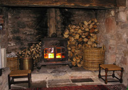 The cottage is a single storey converted cow barn with a large open plan living area with exposed wooden roof trusses. There is a wood burning stove in the huge inglenook fire place and a plentiful supply of logs from our woodland. The kitchen has a dishwasher, microwave, halogen hob and oven and is well equipped with modern stainless steel utensils. The cottage has one bedroom with a fine double bed with white cotton linen as well as a single bed suitable for a child. A travel cot is also available. Bed linen and towels are provided. The ensuite bathroom has a white suite with bath and shower.To see the cottage from the outside click here |