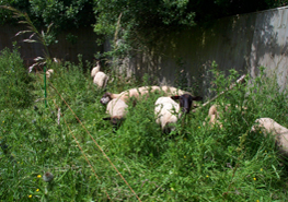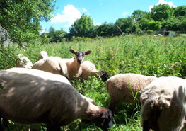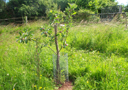 We began work on the new orchard in February after the pigs had turned over the soil. We marked out a grid with the trees 14 feet apart and we dug and prepared the planting holes by adding some organic matter in the form of well rotted horse manure. After planting we drove in hasel stakes from the coppice and made tree guards with rabbit wire. The whole project took a couple of weeks to complete.We planted a mixture of eating and cooking apples as well as pears and a handful of plums. By June the trees were well established with the three year old trees bearing a little fruit. by June the grass was waist height so we rigged up a patchwork of electric fencing to allow the sheep to eat the grass whilst keeping them away from the young trees. Henry the goat is banned from the orchard.We have planted 63 trees in total, 22 of them are three year old trees and the remainder are one year old whips. We have chosen traditional varieties such as Laxton's superb, Tydemans Late Orange and Ashmeads Kernel and it will be interesting to see which trees thrive in this location. To see a list of the varieties planted and links to our suppliers please click on the apple